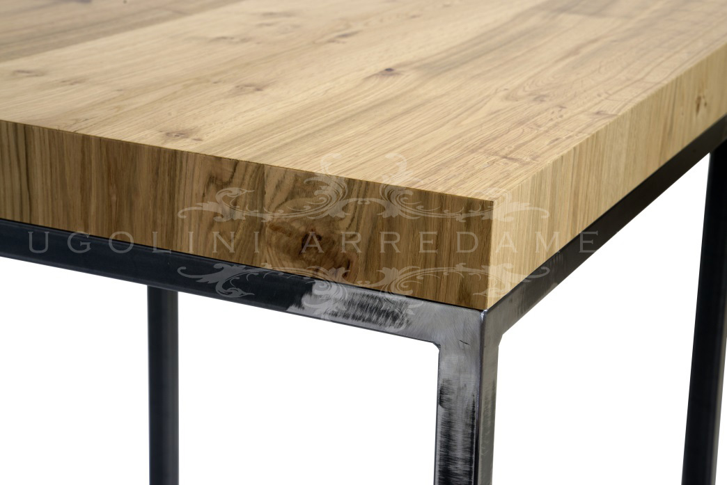 Table made of 30 x 30 mm black tubular frosted metal base and veneered oak wood square top, thickness 70 mm.