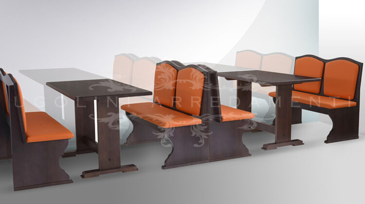 Set tavolo e panche in legno di tulipier massello tinto noce con sedile e schienale imbottito in ecopelle, tavolo sempre in tulipier massello tinto noce con piedino in metallo. Articolo che ben si sposa con un ambiente leggermente retrò di una sala da tè o caffetteria, ma adatto anche ad un ristorante raffinato ed attuale.…