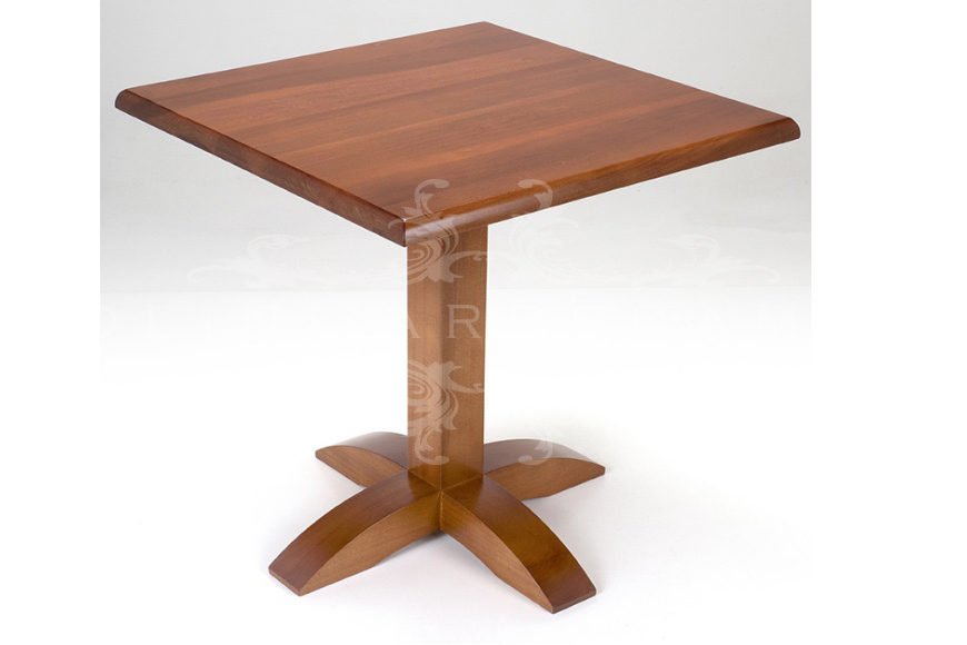 Tavolo per pasticceria in tulipier massello a base centrale, con piano quadrato a bordo lavorato…